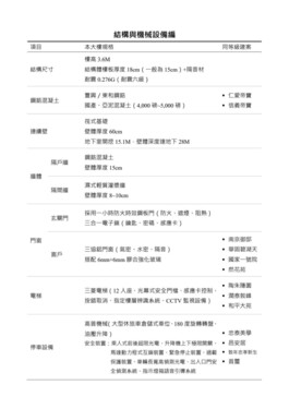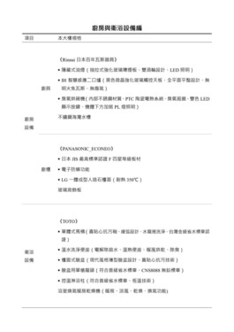 車位規劃倉儲式車位10個。公共設施有接待大廳、空中花園、信箱區。建材規劃三協鋁門窗、Panasonic系統廚櫃、RINNAI三機(抽油煙機/IH爐/烘碗機)、TOTO衛浴、HANSGROHE五金。
