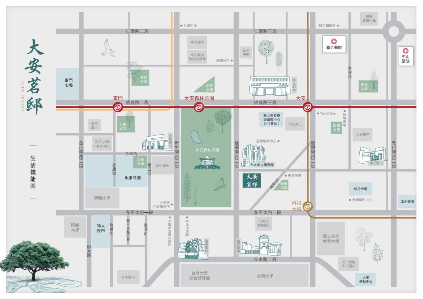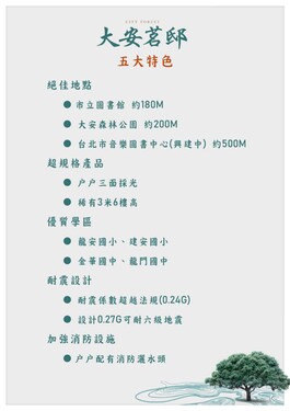 「大安茗邸」坐落於大安森林公園第一環,靜謐氛圍加上完善的生活機能,擁有得天獨厚絕佳地段;瑞安街更以首席城市公園為景,沐浴臺北市立圖書館藝文書香中,迎接全台首座音樂圖書中心盛世光景。