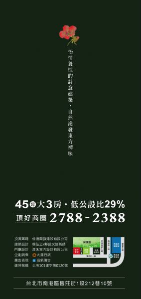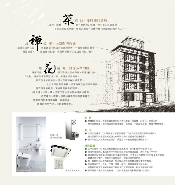 戶數單純僅10戶、45坪大三房規劃、戶戶B1坡道平面車位 五層電梯大樓、臺北市區稀有低公設比29.97% 衛浴:主臥浴室配備TOTO電腦馬桶、搭配TOTO其他衛浴設備 廚具:整體歐化廚具搭配杜邦人造石檯面、林內雙口爐、烘碗機等 STUDOR排水通氣防疫系統:1.防止穢氣於排水系統亂竄,確保社區衛生安全。 2.有效保護水封,避免臭氣、蚊蟲入侵家中,提升居家健康、衛生。 3.防止病毒(SARS、禽流感)藉由排水管路,造成整棟建築的垂直感染。 長庚生物科技諧振活水處理設備:已先進的生物陶瓷,製造出可改變水質分子結構的諧振活化水處理器,活化水質、過濾有機雜質,讓每天使用的水,都是百分百純淨自然的健康水。 USB插座及照明複合移動電源充電器