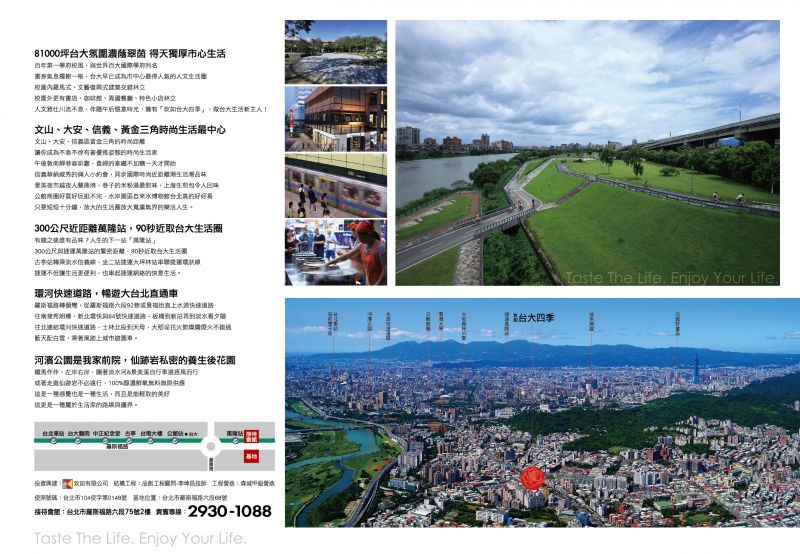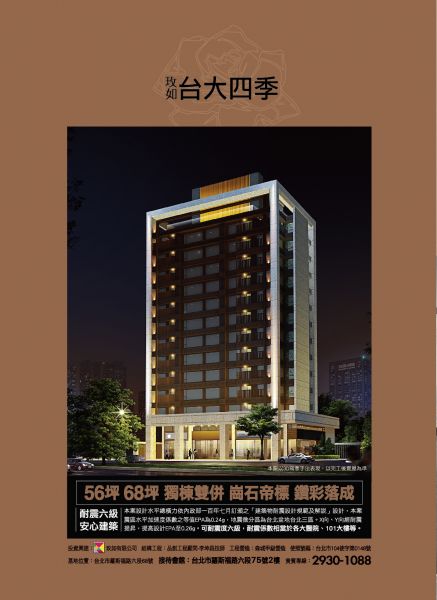 採光佳、格局方正、明亮通風、平面車位、機械停車位、氣派大廳、屋況完善、空間使用寬敞、空間感舒適、交通方便、極簡主義風格、高質感建材、鄰近捷運、面10米以上道路、歡迎來電看屋、新成屋、有門禁管理 300公尺 萬隆捷運站 90 秒 台灣大學生活 0 距離 羅斯福路燙金門牌 1 站近 公館繁華商圈 1 線間 景美文山後花園 大傲若謙,驕傲的地段,謙遜的態度 百年大學之道,名人黃金商道 低調、內斂、深藏不露的大砌度 在羅斯福路上 最美的一段 綻放 投資興建:玫如有限公司 建築設計:李岳軍建築師事務所 營造監工:森城甲級營造 使照號碼:臺北市105使字第0148號 基地位置:臺北市羅斯福路六段68~72號 接待會館:臺北市羅斯福路六段75號2樓 貴賓專線:2930-1088/0981-199-066 建材設備: 1.防火防爆鑄鋁鋼木門搭配義大利CISA熱感應式電子門鎖 2.室內空間均採用石材地坪 3.智慧型影視保全系統 4.德國進口störmer廚具 5.台灣藍天BLUE SKY全嵌式烘碗機 6.台灣藍天BLUE SKY上掀門電器收納櫃 7.台灣藍天BLUE SKY雙插座上掀門電器收納櫃 8.義大利BEST 排油煙機 9.義大利BEST 崁入式多功能旋風烤箱 10.日本原裝進口林內檯面式內焰三口瓦斯爐 11.美國杜邦人造石檯面 12.德國PAIDOK不銹鋼大單槽 13.德國HANSGROHE廚房伸縮龍頭 14.美國Everpure愛惠浦濾水器 15.日本TOTO衛浴 16.三菱暖房乾燥機 17.林內循環迴水機 18.林內熱水器 19.降版預鑄浴缸 20.一太E衛廚蒸汽機 21.三菱活氧全熱交換器 22.紫外線殺菌及臭氧淨水設備 23.CIP環氧樹脂塗裝鑄鐵管 24.三菱電梯 25.FTTH光纖到戶 26.昭和鋁門窗搭配膠合玻璃
