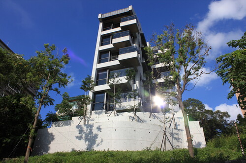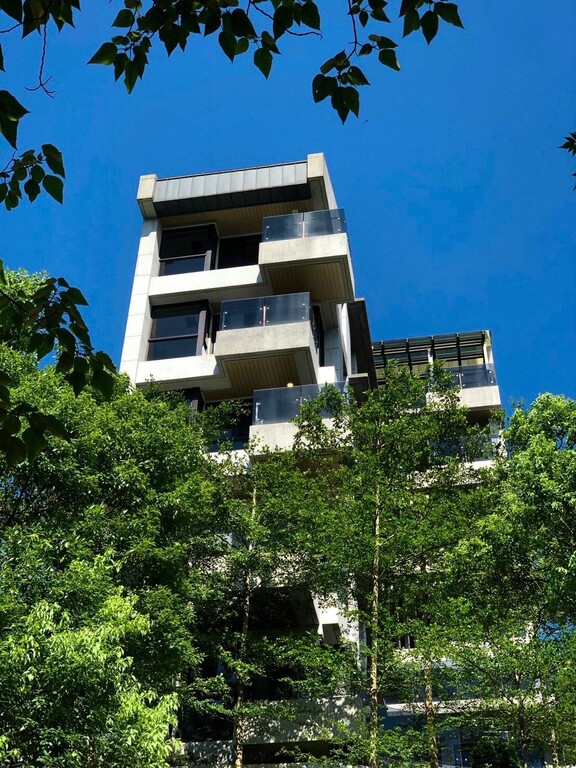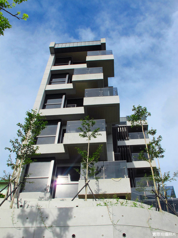 ●斜屋頂別於一般建案施作,是採用「德國進口鋁合金造型鋁板」(保固50年),使整體外觀線條更俐落呈現。
