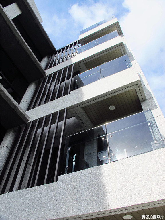 ●立面主體為抿石子、山形磚以及搭配造型玻璃欄杆與金屬格柵整體規劃設計。